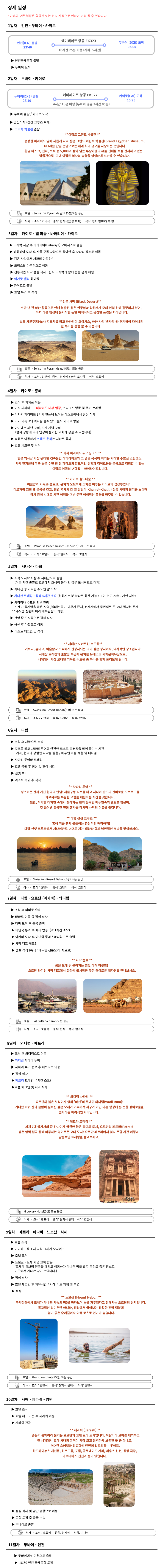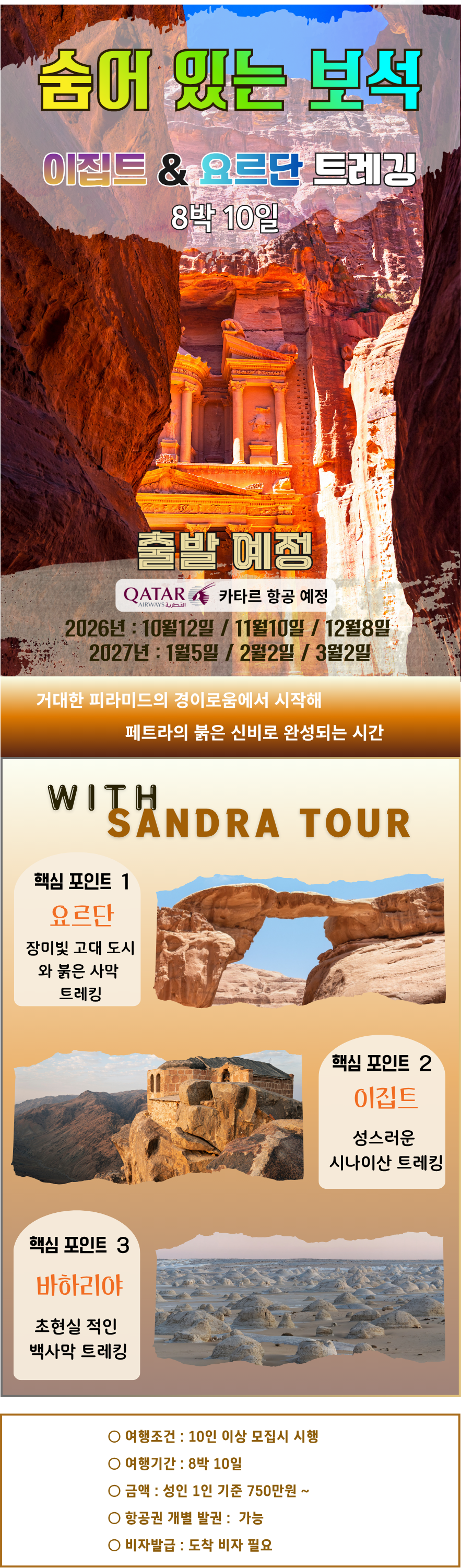 이집트와 요르단은 일교차가 크고 햇살이 강렬합니다. 특히 트레킹 전문 상품인 만큼, 레이어드 복장과 자외선 차단용품을 철저히 준비하는 것이 중요합니다.