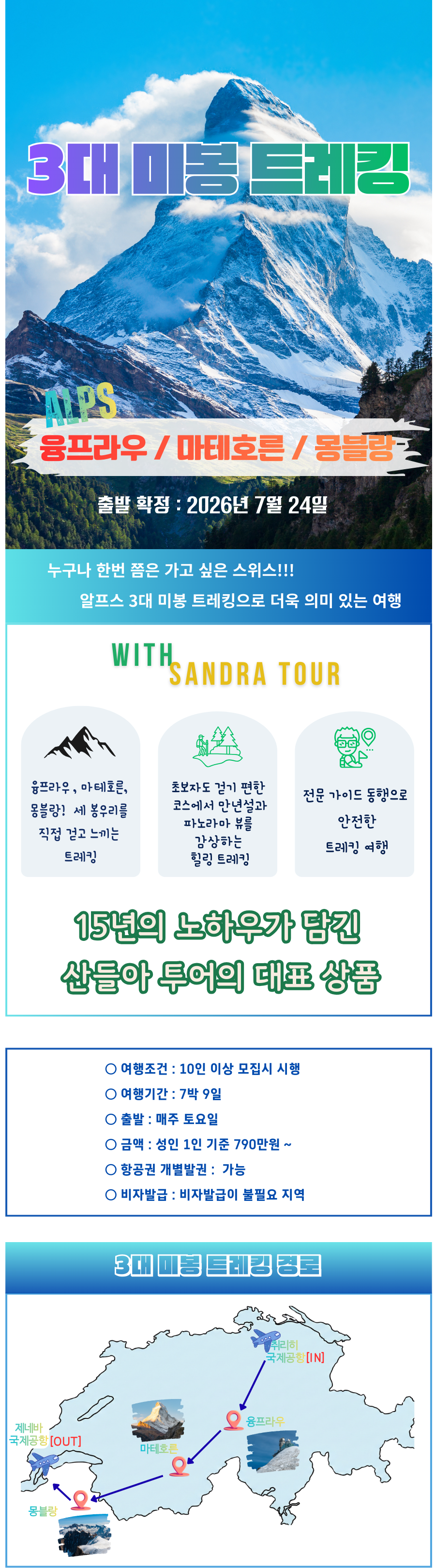 산들아투어와 함께라면 언제 가도 아름다운 알프스이지만, 트레킹이 가능한 **여름 시즌**을 놓치지 않고 방문해 보세요. 각 달마다 가진 매력이 또 다르답니다!