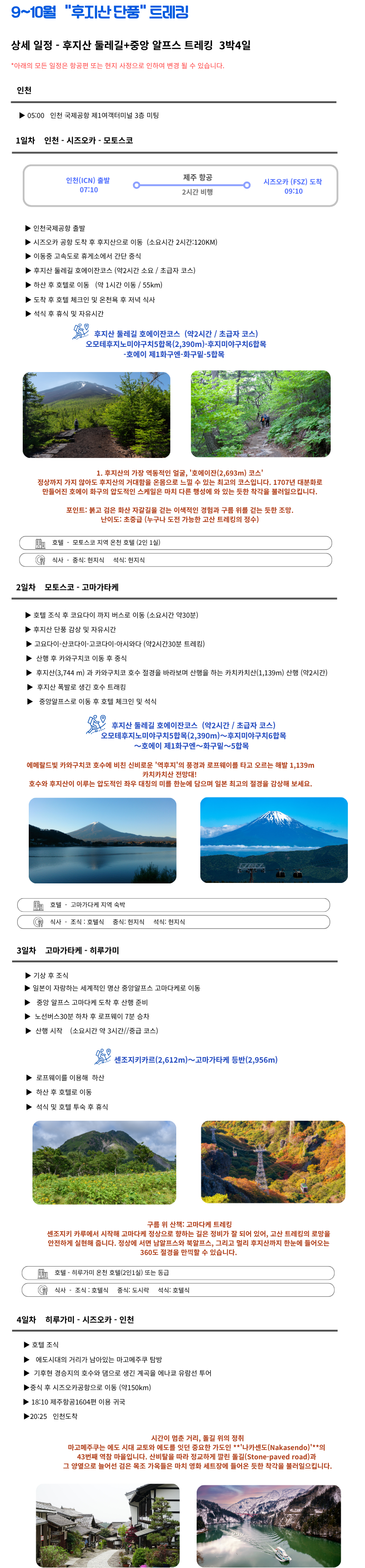 여행일정 중 발생할 수 있는 모든 안전사고에 유의하시고, 가이드의 안내사항 및 안전수칙을 준수하시기 바랍니다. 여행자 본인의 과실로 인한 안전사고는 본인이 책임을 지게 됩니다.