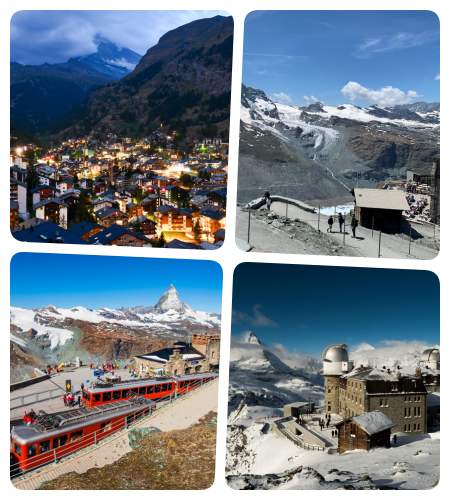 1. 오전 이동 : 그린델발트 → 타쉬(Täsch)역까지 전용 차량 이동 (약 3시간) 2. 체르마트 이동 : 타쉬역 → 체르마트(Zermatt)까지 산악열차 이동 (약 15분) 3. 중식 및 보관 : 체르마트 도착 후 호텔 짐 보관 및 중식 4. 트레킹 : 고르너그라트 전망대(3,089m) & 고르너그라트 트레일 (약 2시간 소요, 스위스 최고봉 몬테로사(4,634m)와 마테호른(4,478m) 조망) 5. 이동 수단 : 체르마트 → 고르너그라트 ▒ 산악열차 이용 (약 30분, 하산 시 체력에 따라 트레킹 또는 기차 이용)